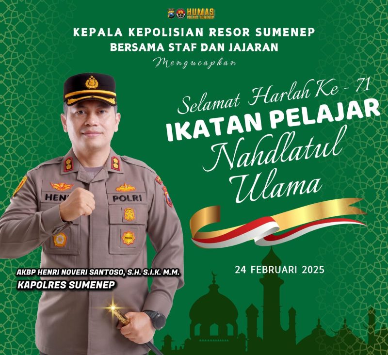 SUMENEP – Kepala Kepolisian Resor (Kapolres) Sumenep, AKBP Henri Noveri Santoso, S.H., S.I.K., M.M., bersama staf dan jajarannya, menyampaikan ucapan selamat atas peringatan Hari Lahir (Harlah) ke-71 Ikatan Pelajar Nahdlatul Ulama (IPNU).