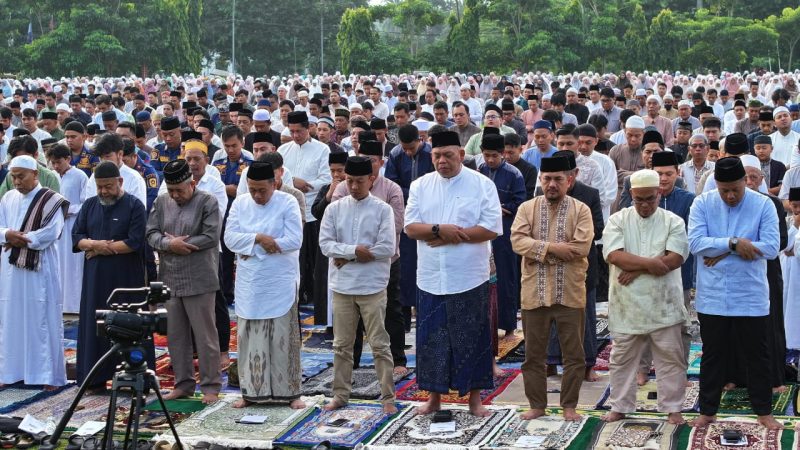 Cibinong – Bupati Bogor, Rudy Susmanto, bersama Wakil Bupati Bogor, Jaro Ade, melaksanakan Shalat Idul Fitri 1446 Hijriah bersama masyarakat Kabupaten Bogor di Lapangan Tegar Beriman, Cibinong, pada Senin (31/3/25). Shalat yang dihadiri oleh berbagai elemen masyarakat, termasuk seluruh pejabat daerah Kabupaten Bogor, berlangsung dengan penuh khidmat dan rasa syukur.
