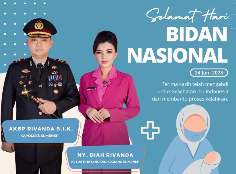 SUMENEP – Dalam momentum Hari Bidan Nasional yang diperingati setiap tanggal 24 Juni, Kepala Kepolisian Resor (Polres) Sumenep, AKBP Rivanda S.I.K., bersama Ketua Bhayangkari Cabang Sumenep, Ny. Diah Rivanda, menyampaikan apresiasi mendalam kepada para bidan atas dedikasi dan pengabdian luar biasa mereka bagi kesehatan ibu dan anak di seluruh penjuru tanah air.