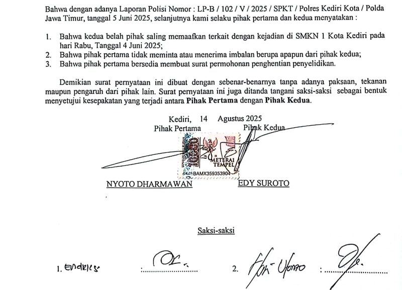 Kesepakatan ini dicapai melalui proses mediasi di Ruang Gelar Perkara Satreskrim Polresta Kediri pada Kamis (14/8/2025) siang, disaksikan langsung oleh penyidik dan sejumlah saksi.