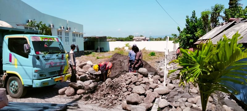 Pantauan di lapangan, Kamis (14/8/2025), pekerja tampak mengaduk material seadanya tanpa mesin molen.