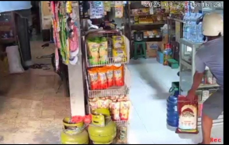 PROBOLINGGO KOTA — Sebuah aksi pencurian sekarung beras terekam kamera pengawas di sebuah toko sembako di Jalan Pahlawan, Kelurahan Kebonsari, Kecamatan Kanigaran, Kota Probolinggo, pada 28 Agustus 2025 lalu.