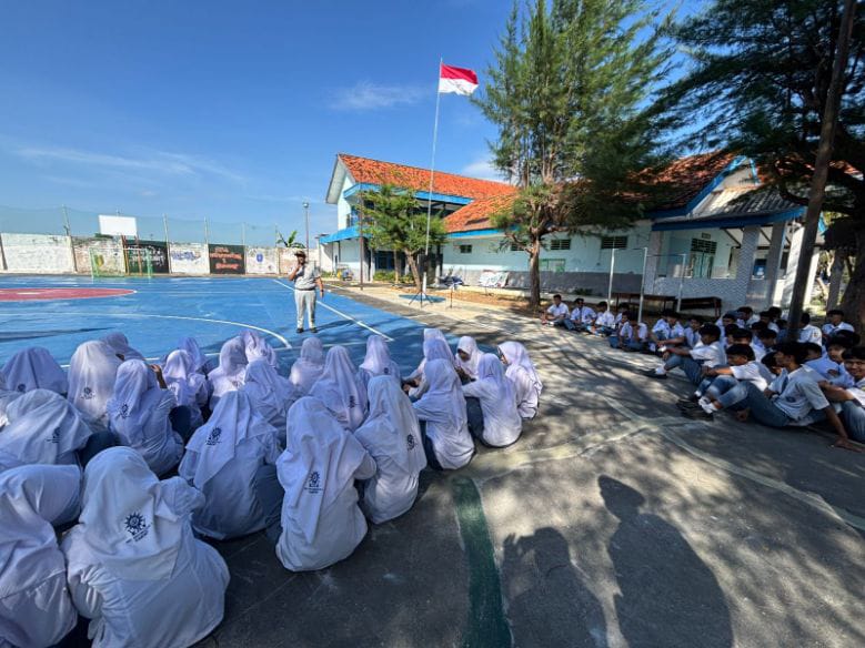 SUMENEP – Ratusan siswa SMA Muhammadiyah Sumenep tampak antusias mengikuti kegiatan Police Goes to School yang digelar Satlantas Polres Sumenep bekerja sama dengan Jasa Raharja, Senin (15/09/2025).