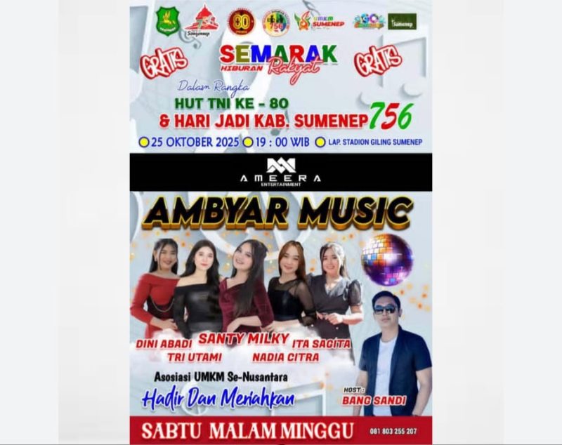 SUMENEP — Malam Minggu ini, Lapangan Stadion Giling Sumenep diprediksi akan menjadi pusat perhatian masyarakat. Sebuah agenda besar bertajuk “Semarak Hiburan Rakyat” siap digelar dalam rangka HUT TNI ke-80 dan Hari Jadi ke-756 Kabupaten Sumenep, Sabtu (25/10/2025) pukul 19.00 WIB.