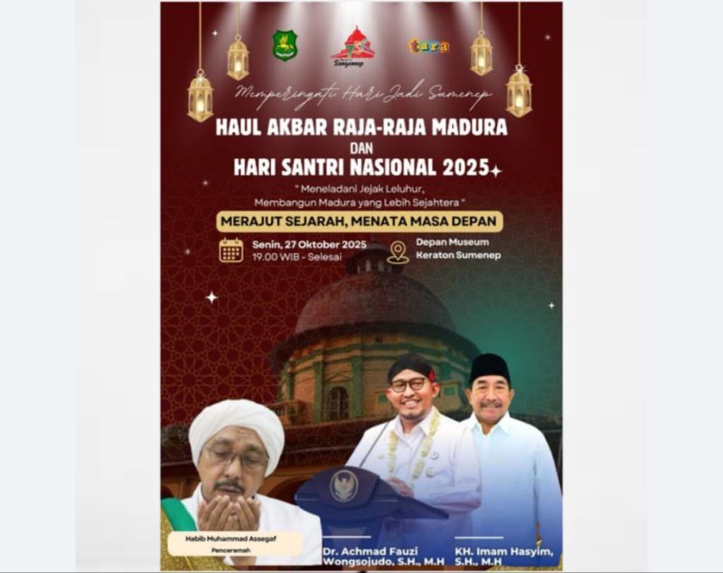 SUMENEP, 27 Oktober 2025 — Dalam rangka memperingati Hari Jadi Sumenep ke-756 sekaligus Hari Santri Nasional 2025, Pemerintah Kabupaten Sumenep menggelar acara Haul Akbar Raja-Raja Madura yang akan berlangsung di depan Museum Keraton Sumenep, Senin malam (27/10/2025) mulai pukul 19.00 WIB.