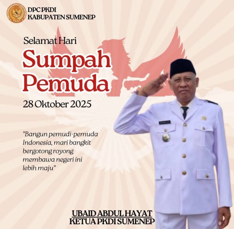 SUMENEP – Persaudaraan Kepala Desa Indonesia (PKDI) Kabupaten Sumenep menyampaikan ucapan selamat Hari Sumpah Pemuda dan mengajak generasi muda untuk memahami makna sejarah perjuangan pemuda Indonesia. Ketua PKDI Sumenep, H. Ubaid Abdul Hayat, menekankan bahwa semangat persatuan dan kesatuan yang diikrarkan pada 28 Oktober 1928 harus tetap hidup di hati anak-anak muda saat ini.