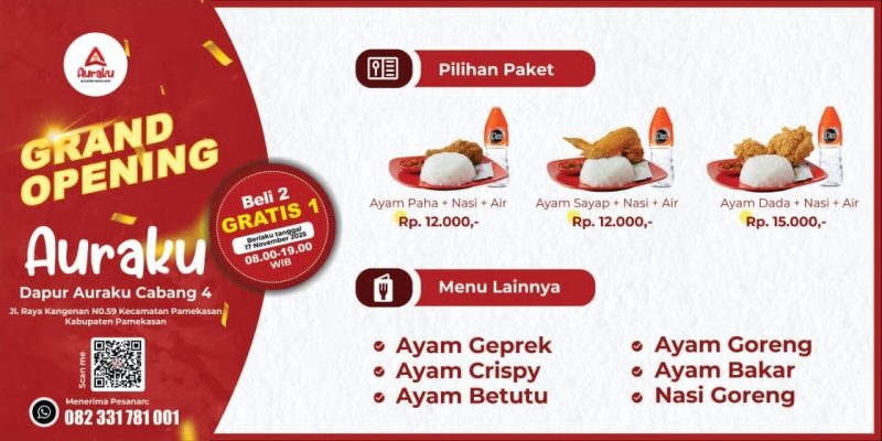 Dalam rangka grand opening, Auraku menghadirkan promo spesial Beli 2 Gratis 1, berlaku pada 17 November 2025 pukul 08.00–19.00 WIB. Promo ini menjadi kesempatan bagi masyarakat untuk menikmati berbagai pilihan paket hemat, seperti Ayam Paha + Nasi + Air Rp 12.000, Ayam Sayap + Nasi + Air Rp 12.000, dan Ayam Dada + Nasi + Air Rp 15.000. Selain itu, tersedia pula menu lainnya seperti Ayam Geprek, Ayam Crispy, Ayam Betutu, Ayam Goreng, Ayam Bakar, hingga Nasi Goreng.
