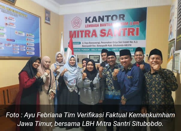 Sebelumnya, LBH Mitra Santri Situbondo sempat menerima kunjungan Tim Verifikasi Faktual Kemenkumham Jawa Timur pada Selasa, 14 Mei 2024. Dalam kunjungan tersebut, pengurus LBH Mitra Santri bahkan sempat berfoto bersama tim verifikasi, sebagai bagian dari tahapan penilaian faktual.