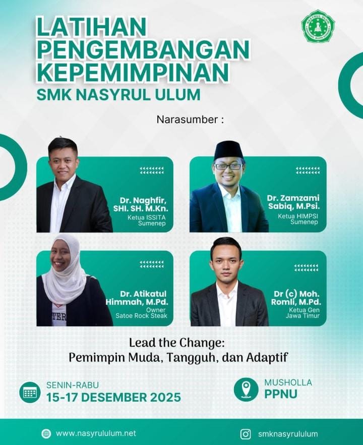 SUMENEP – SMK Nasyrul Ulum akan menggelar kegiatan Latihan Pengembangan Kepemimpinan sebagai upaya membekali peserta didik dengan kemampuan kepemimpinan yang tangguh dan adaptif di tengah tantangan zaman. Kegiatan ini dijadwalkan berlangsung selama tiga hari, mulai Senin hingga Rabu, 15–17 Desember 2025, bertempat di Musholla PPN U.