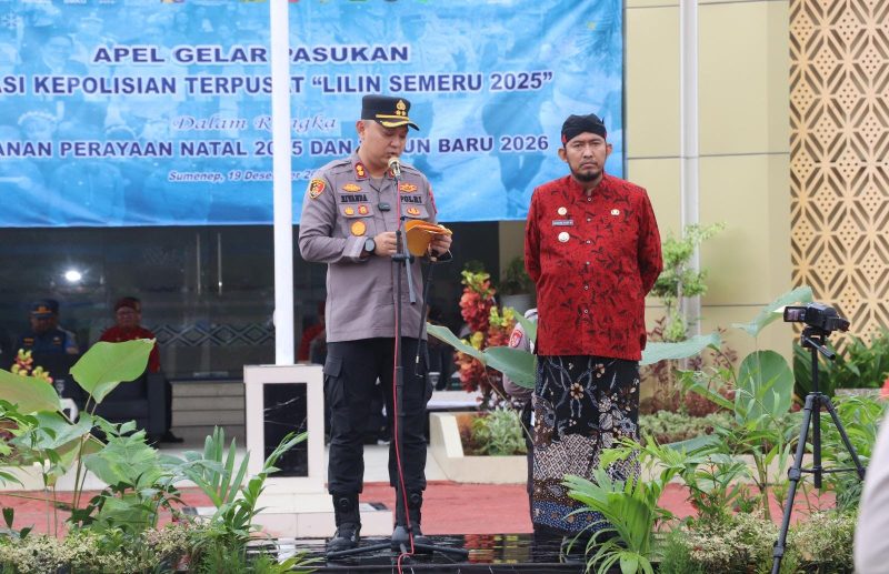SUMENEP — Polres Sumenep resmi menggelar Apel Gelar Pasukan Operasi Kepolisian Terpusat “Lilin Semeru 2025” sebagai bentuk kesiapan pengamanan dan pelayanan perayaan Natal 2025 dan Tahun Baru 2026, Jumat (19/12/2025) sore. Kegiatan berlangsung di Lapangan Tribrata Mapolres Sumenep, Jalan Urip Sumoharjo Nomor 35, Desa Pabian, Kecamatan Kota, Kabupaten Sumenep.