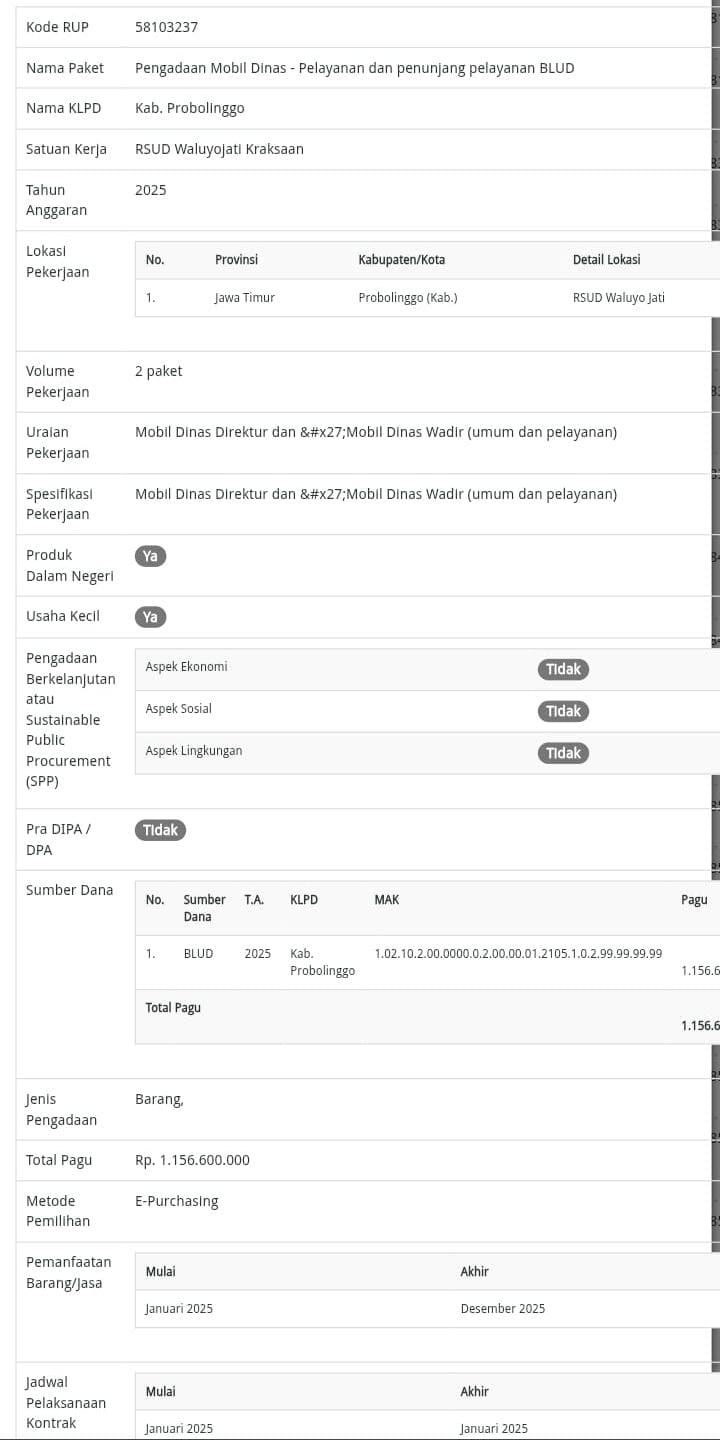 Sistem Informasi Rencana Umum Pengadaan (SIRUP) LKPP mencatat, pengadaan mobil dinas untuk direktur dan wakil direktur (wadir) tahun anggaran 2025 mencapai Rp 1,156.600.000. RSUD membeli satu unit Toyota Innova Zenix 2.0 V HV Modelista CVT dan dua unit Toyota Veloz 1.5 A/T, semua berwarna hitam non-premium.