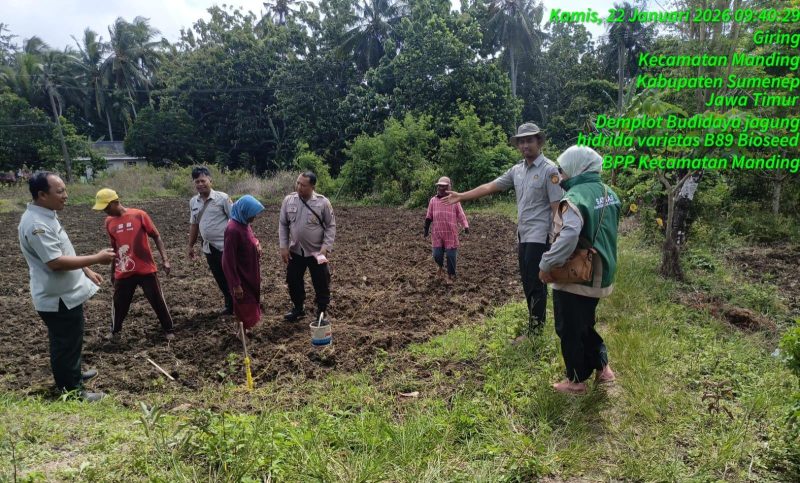 SUMENEP — Koordinator Penyuluh (Korluh) Kecamatan Manding bersama Polsek setempat menggelar demonstration plot (demplot) budidaya jagung hibrida varietas B89 di lahan Balai Penyuluhan Pertanian (BPP) Kecamatan Manding.