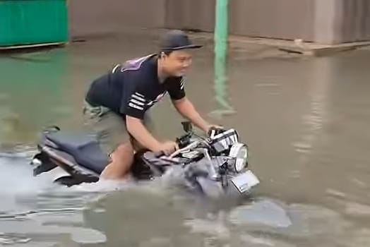 Foto hasil screenshot video yang diunggah akun media sosial berita Comal tersebut,nampak si pengendara menggunakan motor Kawasaki Ninja itu dengan santainya menerabas banjir di saat pengendara motor lain justru nampak ragu-ragu atau berputar balik.
