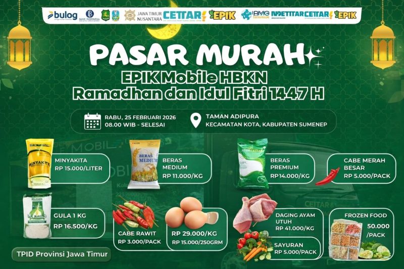 SUMENEP — Pemerintah Kabupaten Sumenep menggelar Pasar Murah Etalase Pengendalian Inflasi Kabupaten/Kota (EPIK) Mobile dalam rangka Ramadan dan menyambut Hari Raya Idulfitri 1447 Hijriah/2026 Masehi.