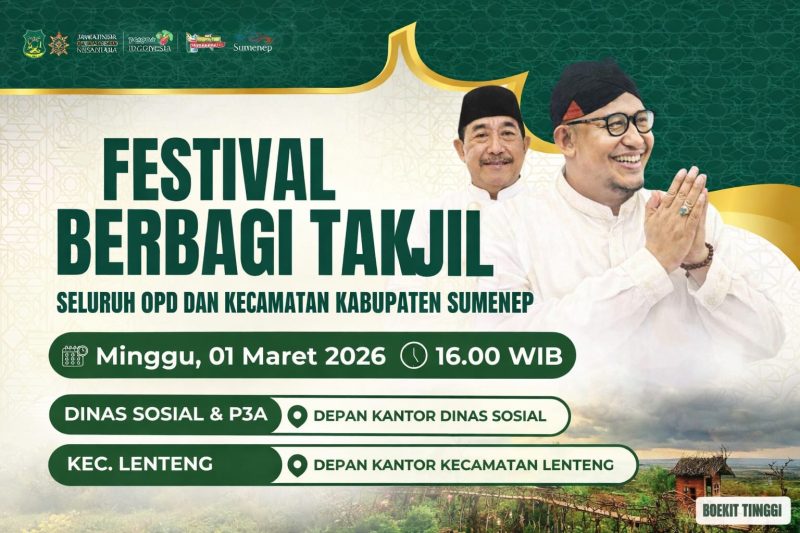 Kegiatan yang digelar Minggu, 1 Maret 2026 pukul 16.00 WIB itu dipusatkan di dua titik, yakni depan Kantor Dinas Sosial & P3A serta depan Kantor Kecamatan Lenteng. Ribuan paket takjil disiapkan untuk masyarakat sebagai simbol kebersamaan dan kepedulian sosial.
