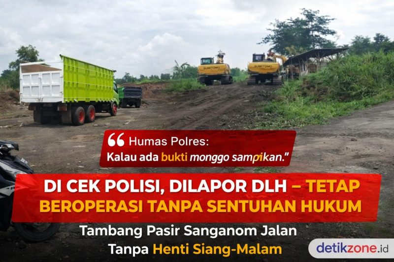 Excavator beroperasi, galian terbuka, dan dump truck keluar masuk mengangkut material pasir. Aktivitas disebut tidak pernah berhenti, bahkan berlangsung hingga malam hari saat warga beristirahat.