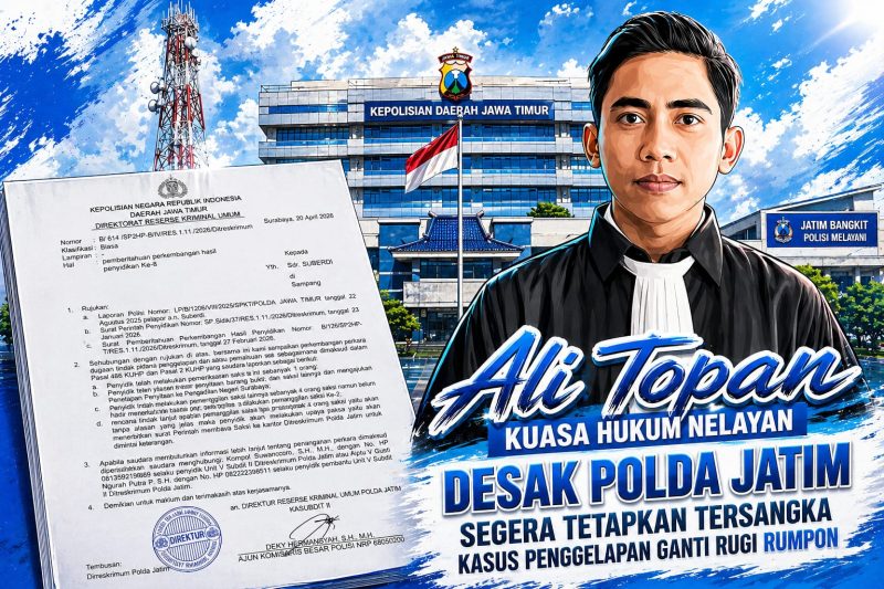 SAMPANG, Detikzone.id — Penanganan kasus dugaan penggelapan dana ganti rugi rumpon nelayan di Polda Jawa Timur mendapat sorotan. Kuasa hukum nelayan, Ali Topan, menilai proses penyidikan berjalan lamban tanpa perkembangan signifikan meski perkara telah bergulir selama berbulan-bulan, Minggu (26/04/2026).
