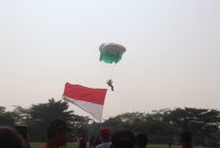 CIBINONG- Pemerintah Kabupaten (Pemkab) Bogor suguhkan atraksi terjun payung dengan membawa bendera merah putih, bendera Kabupaten Bogor dan bendera Koni Kabupaten Bogor, kepada masyarakat…
